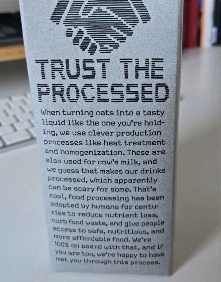 On pack, they are explicitly telling consumers to "trust the processed" and using that space to explain how processing can improve food safety, reduce waste, boost affordability, and protect nutrients. Oatly is trying to reframe what consumers should be evaluating: overall nutritional and environmental performance, not an automatic binary assumption that UPFs are bad. It is a rare example of a major FMCG using its packaging as a mini‑masterclass on processing science, and it may be a preview of how brands will have to show up once "processed" becomes as charged as "GMO" was a decade ago.